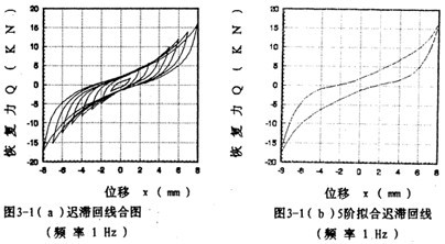 為了說明5階和7階冪函數(shù)多項式擬合的精度情況,以振幅A=8毫米,頻率為1赫茲為例,畫出擬合回線分別如圖3-1(b)、3-1(c)所示,將它們與對應(yīng)試驗回線圖3-1(d)比較,可知7階擬合精度高于5階。圖3-1(e)為圖3-1(b)與圖3-1(d)的合圖。