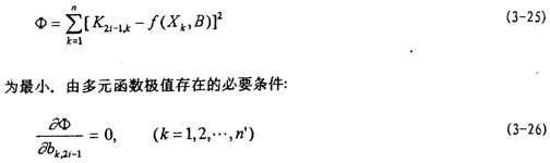 已知K2i-1 (A)是關(guān)于自變量X=[A,A2,…An1]T和待定參數(shù)B=[ b0,2i-1,b1,2i-1,…,bn′,2i-1]T的形式已知的函數(shù)(3-13),簡寫成: