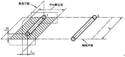 “軸線(xiàn)平面內(nèi)的偏差” f∑δ是在兩軸線(xiàn)公共平面上測(cè)量的,這公共平面是用兩軸承跨距中較長(zhǎng)的一個(gè)L和另一根軸上的一個(gè)軸承來(lái)確定的,如果兩個(gè)軸承的跨距相同,則用小齒輪軸和大齒輪軸的一個(gè)軸承!按怪逼矫嫔系牡钠睢 f∑δ是在與軸線(xiàn)公共平面相相垂直的“交錯(cuò)軸平面”上測(cè)量的。