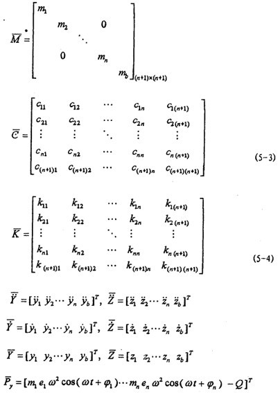 當(dāng)主機(jī)以角速度ω轉(zhuǎn)動(dòng)時(shí),軸系在各偏心力的作用下產(chǎn)生穩(wěn)態(tài)振動(dòng),其運(yùn)動(dòng)微分方程可表示為: