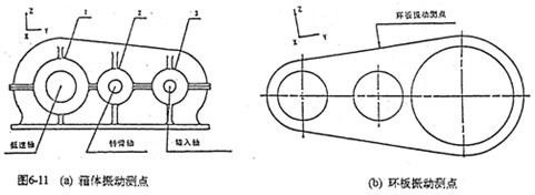 為了將理論分析的結(jié)果與振動(dòng)測(cè)試分析結(jié)果對(duì)比印證,將測(cè)點(diǎn)選在三個(gè)箱體軸承座及齒板支承軸孔的上邊緣,如圖6-11所示。