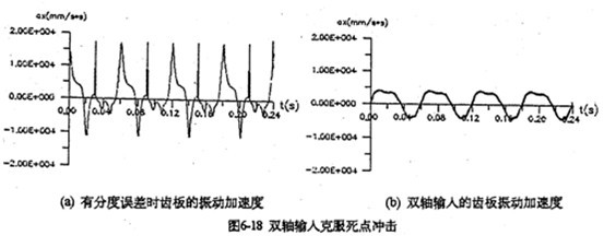 采用雙軸輸人的齒板及箱體軸承座振動(dòng)速度、加速度如圖6-17所示。從圖看出齒板速度及加速度值明顯變小(為單軸輸人時(shí)的0.3倍),而且無(wú)沖擊,完全屬于穩(wěn)太振動(dòng)。箱體的振動(dòng)速度及加速度幅值只是單軸輸人時(shí)的0.2倍。圖6-18a是一軸的偏心套存在0.05度的分度誤差時(shí)齒板的加速度曲線圖,圖中明顯出現(xiàn)加速度沖擊棒線。采用雙軸輸入后,死點(diǎn)沖擊被徹底(見(jiàn)圖6-18b) , 變成穩(wěn)態(tài)振動(dòng)曲線了。因此,為了減小三環(huán)減速器的振動(dòng),有必要加大三環(huán)減速器的橫向尺寸,在箱體內(nèi)增加一套雙軸輸入的齒輪功率分流機(jī)構(gòu),或者在箱體外另設(shè)計(jì)一套功率分流機(jī)構(gòu),以解決機(jī)構(gòu)過(guò)死點(diǎn)的振動(dòng)問(wèn)題。