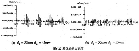 增加高速軸的剛度是降低沖擊載荷的重要途徑。軸的剛度大(值徑大),扭轉(zhuǎn)、彎曲變形小,雙曲柄機(jī)構(gòu)變形也就小,這樣既減小了沖擊振動(dòng)、又增加了軸的強(qiáng)度。圖6-22將高速軸的直徑由原來(lái)的45mm加到55mm后的,振動(dòng)加速度圖。