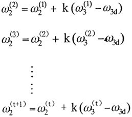 設(shè)ω1、ω2、ω3、k分別為常速電機(jī)輸入速度,伺服電機(jī)的輸入速度,輸出速度,理論輸出速度(理想值)和加權(quán)因子,e為輸出速度和理論輸出速度值的誤差范圍。迭代周期以常速電機(jī)旋轉(zhuǎn)一周(2π)為一周期,迭代進(jìn)行一次。
