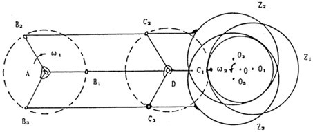 眾所周知,雙曲柄機構(gòu)的最大缺點就是存在死點位置,即當曲柄,與連桿共線時,機構(gòu)處理運動不確定位置,其傳動角為零,機械無法運動。為了克服死點位置,目前已出現(xiàn)了三種解決方法:其一是在同一行星輪上布置多套雙曲柄機構(gòu)的方法:其二是采用雙曲柄動力輸入式方法;基三是采用多相并列式雙曲柄機構(gòu)來克服死點的方法。三環(huán)減速器就是用三相并列雙曲柄機構(gòu)來克服死點位置,如圖2-2所示。