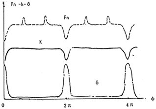 )成正比。一般情況下,高速重載的三環(huán)減速器、環(huán)板機構(gòu)的剛度嚙合力等均較大,因此死點處受到的沖擊越大,且沖擊脈沖寬度小(反比于角速度),激振頻率更寬,更易激起廣泛的共振。