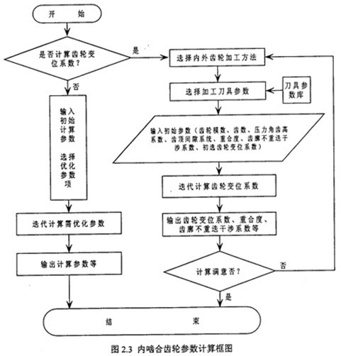 在少齒差內嚙合傳動中,變位系數的確定是設計的關鍵。齒輪的實際幾何尺寸與齒輪的加工方法有直接的關系,所以用不同的齒輪加工方法的計算公式來推導變位系數的迭代公式,所得迭代結果不一樣。內嚙合齒輪參數計算模塊中,已經由公式(2.5 )~(2.9 )推導了少齒差內嚙合傳動的各種實際加工情況下的變位系數的計算迭代公式,圖(2.3)為齒輪變位系數計算框圖。