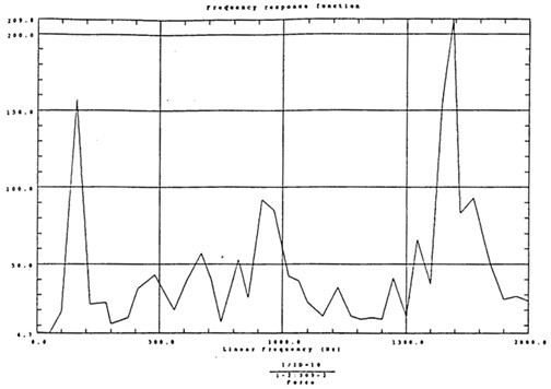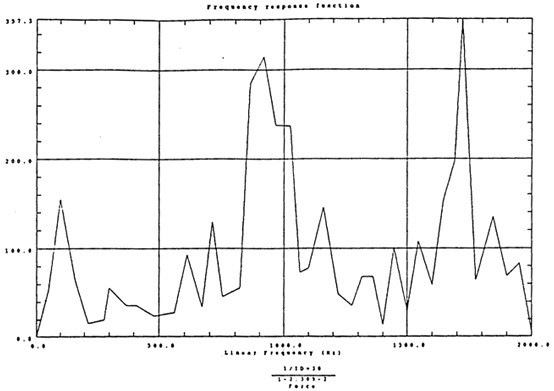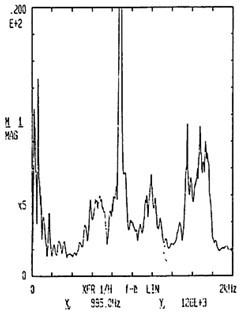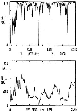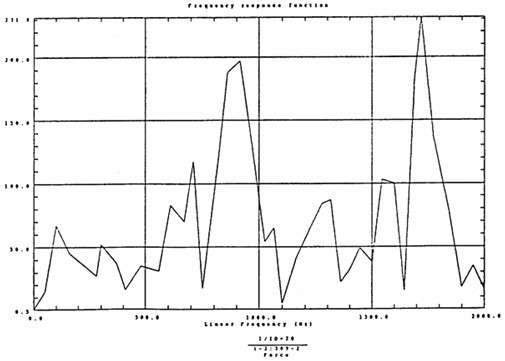 有了脈沖激勵(lì)信號(hào)和脈沖響應(yīng)信號(hào)后,CF-355頻譜分析儀就能計(jì)算出測點(diǎn)12X向由于14點(diǎn)X向激勵(lì)間的頻響函數(shù)H(ω)及其相干函數(shù),如圖4-5所示。圖4-6是頻響函數(shù)H(ω)的倒數(shù)。