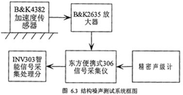 在測試產(chǎn)對所有的加速度傳感器,放大器及數(shù)據(jù)自動(dòng)采集處理系統(tǒng)進(jìn)行校準(zhǔn),對規(guī)定的所有測點(diǎn)進(jìn)行打磨,平磨并做好標(biāo)記,測試時(shí)在規(guī)定工況下依次將傳感器磁性底座放在各測點(diǎn)上。傳感器測得的振動(dòng)信號(包括速度級和加速度級振動(dòng)信號)經(jīng)電荷放大器放大后進(jìn)入16通道卡式采集儀進(jìn)行采集記錄,用智能動(dòng)態(tài)信號分析儀分析各測點(diǎn)的1/3倍頻程度級結(jié)構(gòu)噪聲,再對所有的測點(diǎn)的結(jié)構(gòu)噪聲值做對數(shù)平均,得到總的結(jié)構(gòu)噪聲頻譜圖?諝庠肼曈寐暭売(jì)測量減速裝置各個(gè)測點(diǎn)的A計(jì)權(quán)聲壓級和1/1倍頻程聲壓級。各測點(diǎn)距齒輪箱測量表面的距離為1米。測試前已用標(biāo)準(zhǔn)噪聲源HY203-93260對聲級計(jì)進(jìn)行校準(zhǔn)。測試系統(tǒng)框圖如圖6.3所示。測試設(shè)備如下: