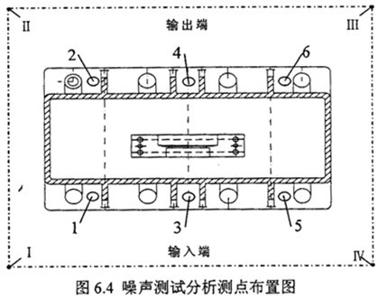 結(jié)構(gòu)振動(dòng)噪聲測試在齒輪箱安裝基腳布置6個(gè)測點(diǎn),測點(diǎn)布置圖見圖3中1-6測點(diǎn),在每一測點(diǎn)上按31.5Hz~5kHz1/3倍頻中心頻率測試加速度級頻譜(re:a0=10-6m/s)和1/3倍頻中心頻率測試速度級頻譜(re:a0=5*10-8m/s)。空氣噪聲測試聲壓級基準(zhǔn)2*10-5Pa,用聲級計(jì)上的A計(jì)權(quán)聲壓級和1/1倍頻程聲壓級測量減速齒輪裝置各個(gè)測點(diǎn)。各測點(diǎn)距齒箱測量表面的距離為1米。測點(diǎn)位置見測點(diǎn)布置圖6.4中Ⅰ-Ⅳ測點(diǎn)。