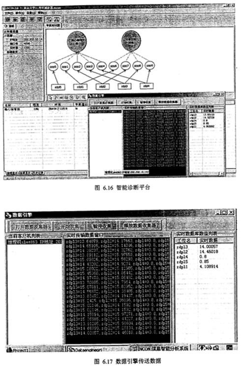 綜上分析,采用人機(jī)交互方式將Zdp14、Zdp15等參數(shù)輸入計(jì)算機(jī),智能診斷系統(tǒng)得到雙環(huán)減速器故障診斷結(jié)果,偏心軸彎曲故障,程度值在0~1范圍變化,齒形誤差較大。智能診斷結(jié)果如圖6.15所示。圖6.16是智能診斷平臺進(jìn)行現(xiàn)場一線診斷分析,圖6.17是數(shù)據(jù)引擎進(jìn)行實(shí)時(shí)數(shù)據(jù)接收和數(shù)據(jù)發(fā)送。