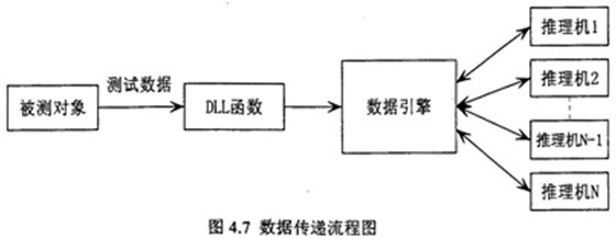 根據(jù)流程圖可知,從故障測試數(shù)據(jù)到數(shù)據(jù)引擎,有兩種數(shù)據(jù)處理方式,一種是故障測試數(shù)據(jù)由數(shù)據(jù)采集系統(tǒng)采集后,可先進(jìn)行預(yù)處理,將故障信號數(shù)據(jù)處理為推理機(jī)所需的故障特征數(shù)據(jù),然后發(fā)送出去,動態(tài)連接庫DLL函數(shù)則通過網(wǎng)絡(luò)接收這些故障特征數(shù)據(jù),同時對照推理機(jī)向數(shù)據(jù)引擎申請的故障特征變量,將申請的故障特征變量對應(yīng)的值找出,按數(shù)據(jù)引擎規(guī)定的格式反送給申請數(shù)據(jù)的推理機(jī)。另一種是故障測試數(shù)據(jù)由數(shù)據(jù)采集系統(tǒng)采集后,按一定格式直接發(fā)送出去,動態(tài)連接庫DLL函數(shù)則通過網(wǎng)絡(luò)接收這些故障信息數(shù)據(jù),然后再進(jìn)行數(shù)據(jù)預(yù)處理,將故障信息數(shù)據(jù)處理為推理機(jī)所需的故障特征數(shù)據(jù),同時對照推理機(jī)向數(shù)據(jù)引擎申請的故障特征變量,將申請的故障特征變量對應(yīng)的值找出,再按數(shù)據(jù)引擎規(guī)定的格式反送給申請數(shù)據(jù)的推理機(jī)。