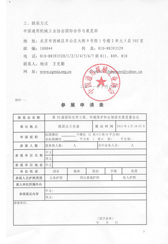 參展方式:預(yù)參展會(huì)員企業(yè)于2011年10月31日前向各專(zhuān)業(yè)分會(huì)報(bào)名并說(shuō)明參展面積;總會(huì)統(tǒng)計(jì)參展商人數(shù)及參展面積后,向阿赫瑪展會(huì)主辦方申請(qǐng)參展總面積,待主辦方確認(rèn)面積及價(jià)格后,向各參展商通報(bào)最終展位價(jià)格并與之共同協(xié)商展位分布。《參展申請(qǐng)表》見(jiàn)附件一。