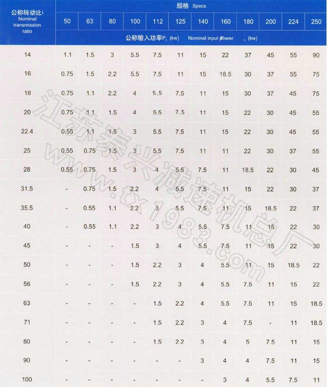 減速器的標記代號中包括減速器型號、公稱中心距、公稱傳動比和公稱輸入功率。