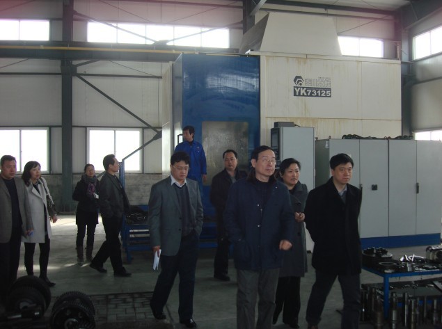 韓祝強縣長、張軍會長、劉占坤總經(jīng)理在大型數(shù)控磨齒機旁