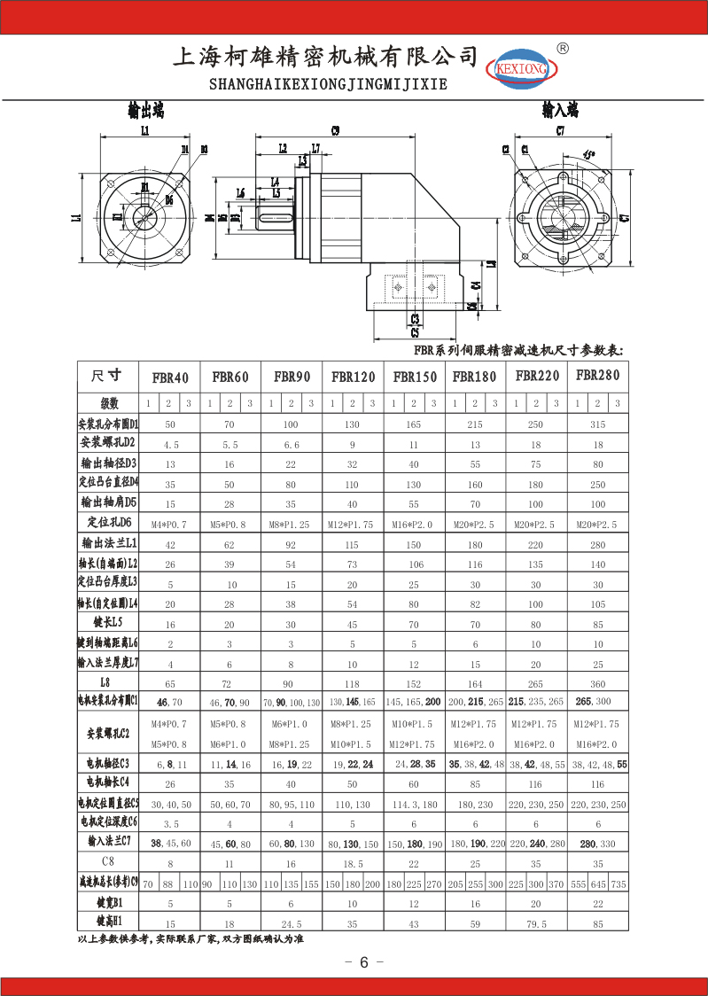 FBR系列伺服直角行星減速器分: FBR40、FBR60、FBR90、FBR120、FBR150、FBR180、FBR220、FBR280、同軸式機(jī)座型號,速比:1-1000有20多個(gè)比速可選擇;分一、二、三級減速傳動(dòng);精度:一級傳動(dòng)精度在4-6弧分,二級傳動(dòng)精度在6-8弧分,三級傳動(dòng)精度7-10弧分;等一千多種規(guī)格