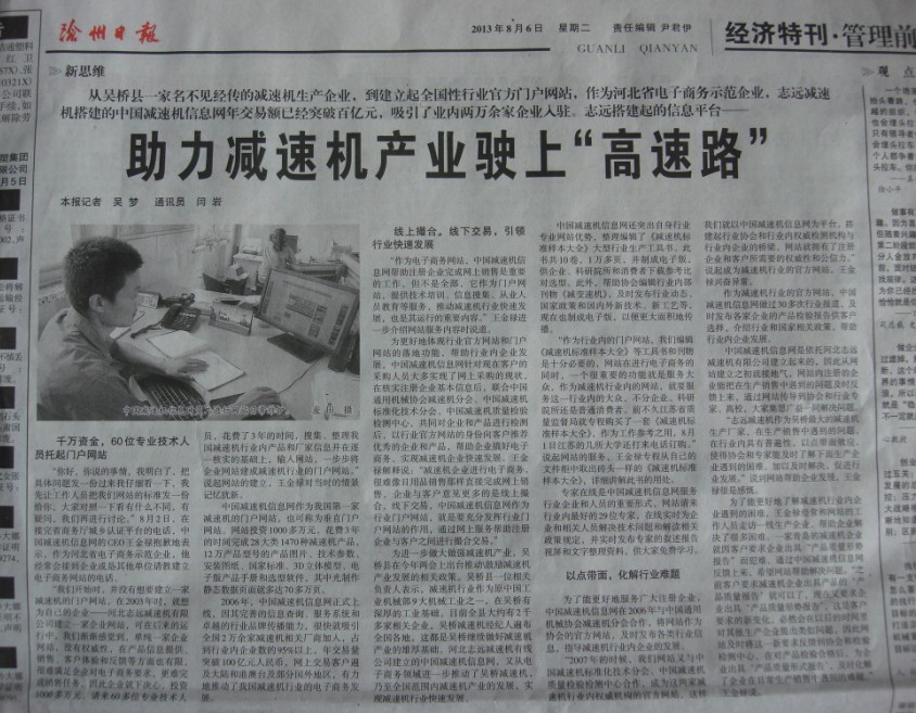 滄州日?qǐng)?bào)報(bào)道減速機(jī)信息網(wǎng)--助力減速機(jī)產(chǎn)業(yè)駛上“高速路”