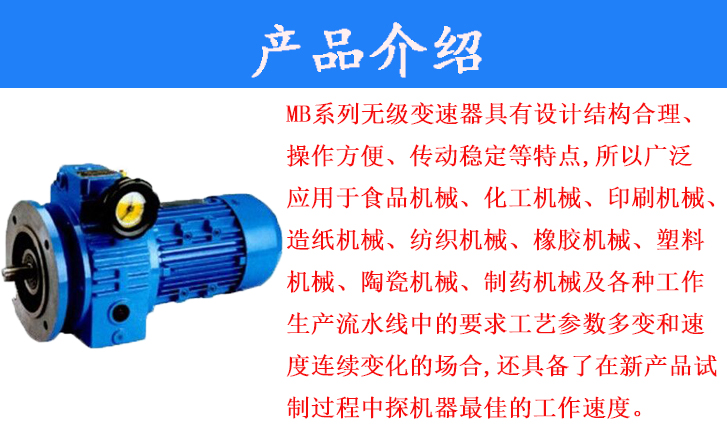 MB系列無級變速器具有設(shè)計結(jié)構(gòu)合理、操作方便、傳動穩(wěn)定等特點(diǎn),所以廣泛應(yīng)用于食品機(jī)械、化工機(jī)械、印刷機(jī)械、造紙機(jī)械、紡織機(jī)械、橡膠機(jī)械、塑料機(jī)械、陶瓷機(jī)械、制藥機(jī)械及各種工作生產(chǎn)流水線中的要求工藝參數(shù)多變和速度連續(xù)變化的場合,還具備了在新產(chǎn)品試制過程中探求機(jī)器最佳的工作速度。