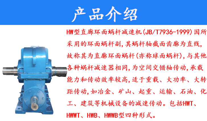HW型直廊環(huán)面蝸桿減速機(JB/T7936-1999)因所采用的環(huán)面蝸桿副,其蝸桿軸截面齒廓為直線,故稱其為直廓環(huán)面蝸桿(亦稱球面蝸桿),與其他各種蝸桿減速器相同,為空間交錯軸傳動,承載能力和傳動效率較高,適用于重載、大功率、大轉(zhuǎn)距傳動,如冶金、礦山、起重、運輸、石油、化工、建筑等機械設(shè)備的減速傳動。包括HWT、HWWT、HWB、HWWB型四種形式。