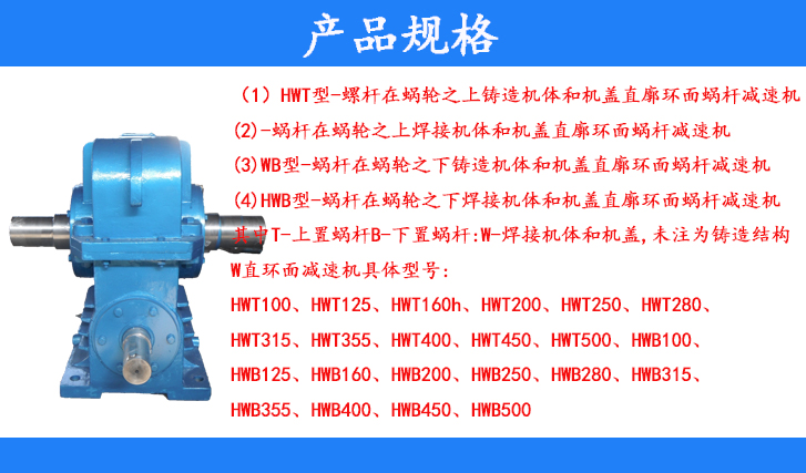 (4)HWB型-蝸桿在蝸輪之下焊接機體和機蓋直廓環(huán)面蝸桿減速機其中T-上置蝸桿B-下置蝸桿:W-焊接機體和機蓋,未注為鑄造結(jié)構(gòu)W直環(huán)面減速機具體型號:HWT100、HWT125、HWT160、HTW200、HWT250、HWT280、HWT255、HWB400、HWB450、HWB500