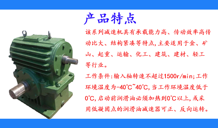 工作條件:輸入軸轉(zhuǎn)速不超過1500r/min;工作環(huán)境溫度為-40℃~40℃,當(dāng)工作環(huán)境溫度低于0℃,啟動前潤滑油必須加熱到0℃以上,或采用低凝固點(diǎn)的潤滑油減速器可正、反向運(yùn)轉(zhuǎn)。