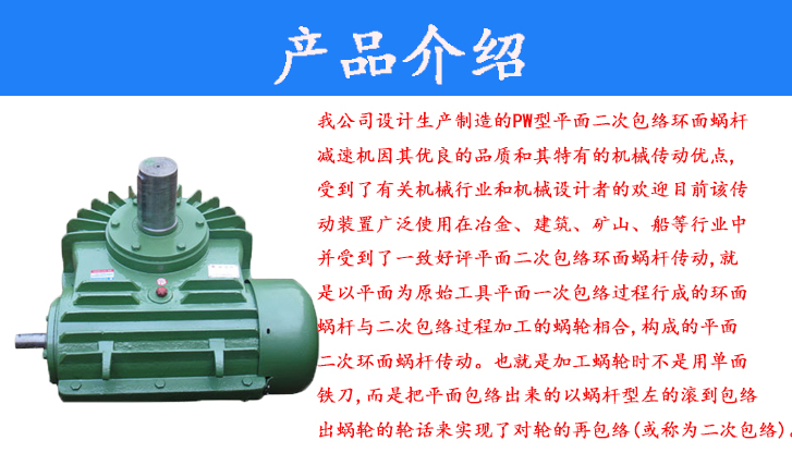 我公司設計生產(chǎn)制造的PW型平面二次包絡環(huán)面蝸桿減速機因其優(yōu)良的品質和其特有的機械傳動優(yōu)點,受到了有關機械行業(yè)和機械設計者的歡迎目前該傳動裝置廣泛使用在冶金、建筑、礦山、船等行業(yè)中并受到了一致好評平面二次包結環(huán)面蝸桿傳動,就是以平面為原始工具平面一次包絡過程行成的環(huán)面蝸桿與二次包絡過程加工的蝸輪相合,構成的平面二次環(huán)面蝸桿傳動。也就是加工蝸輪時不是用單面鐵刀,而是把平面包絡出來的以蝸桿型左的滾到包絡出蝸輪的輪話來實現(xiàn)了對輪的再包絡(或稱為二次包絡)