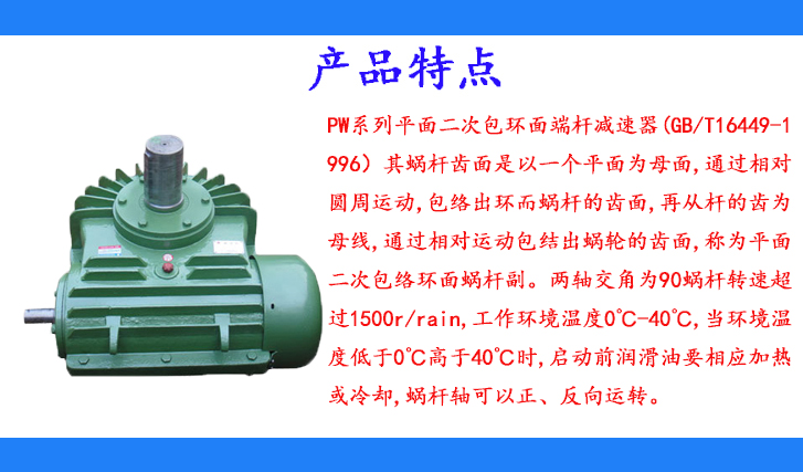 PW系列平面二次包環(huán)面端桿減速器(GB/T16449-1996)其蝸桿齒面是以一個平面為母面,通過相對圓周運動,包絡出環(huán)而蝸桿的齒面,再從桿的齒為母線,通過相對運動包結出蝸輪的齒面,稱為平面二次包絡環(huán)面蝸桿副。兩軸交角為90蝸桿轉速超過1500r/rain,工作環(huán)境溫度0℃-40℃,當環(huán)境溫度低于0℃高于40℃時,啟動前潤滑油要相應加熱或冷卻,蝸桿軸可以正、反向運轉