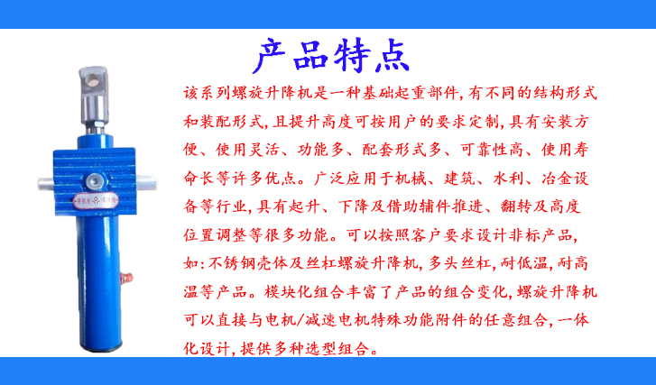 該系列螺旋升降機是一種基礎(chǔ)起重部件,有不同的結(jié)構(gòu)形式和裝配形式,且提升高度可按用戶的要求定制,具有安裝方便、使用靈活、功能多、配套形式多、可靠性高、使用壽命長等許多優(yōu)點。廣泛應(yīng)用于機械、建筑、水利、冶金設(shè)備等行業(yè),具有起升、下降及借助輔件推進、翻轉(zhuǎn)及高度位置調(diào)整等很多功能?梢园凑湛蛻粢笤O(shè)計非標(biāo)產(chǎn)品,如:不銹鋼殼體及絲杠螺旋升降機,多頭絲杠,耐低溫,耐高溫等產(chǎn)品。模塊化組合豐富了產(chǎn)品的組合變化,螺旋升降機可以直接與電機/減速電機特殊功能附件的任意組合,一體化設(shè)計,提供多種選型組合