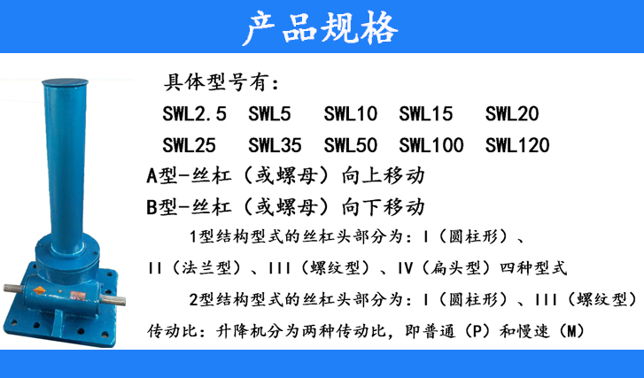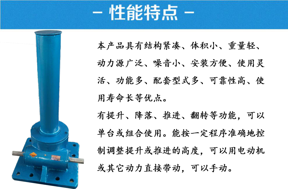 承載能力2.5—120T。具有結構緊湊、積小、重量輕、動力源廣泛、無噪音、安裝方便、使用靈活、功能多、配套形式多、可靠性高、使用壽命長許多優(yōu)點。具有提升、降落、推進、翻轉等多種功能,可以單臺或組合使用,能按一定程序準確地控制調整升或推進的高度,可以用電動機或其它動力直接帶動,也可以手動。最高輸入轉速1500r/min,最大提升速2.7m/min。有不同的結構型式和裝配方式,提升高度按用戶的要求制造。該裝置可以自鎖。