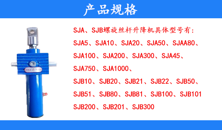 SJA、SJB螺旋絲桿升降機(jī)具體型號有:SJA5、SJA10、SJA20、SJA50、SJA80、SJA100、SJA200、SJA300、SJA450、SJA750、SJA1000