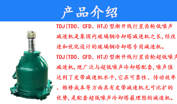 TDU(TDO、CFD、HTJ)型漸開線行星齒輪低噪聲減速機是集國內(nèi)玻璃鋼冷卻塔減速機之長,經(jīng)改進和優(yōu)化設計的玻璃鋼冷卻塔專用減速機。TD(TDO、CFD、HTJ型漸開線行星齒輪超低噪聲減速機,現(xiàn)廣泛與超低噪聲冷卻塔配套,噪聲值達到了皮帶減速機水平,它在可靠性、傳動效率、維修成本等方面具有皮帶減速機無可比擴的優(yōu)勢,是配套超低噪聲冷卻塔最理想的減速機。