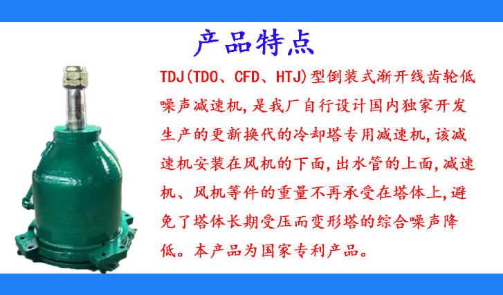 TDJ(TDO、CFD、HTJ)型倒裝式漸開線齒輪低噪聲減速機,是我廠自行設計國內(nèi)獨家開發(fā)生產(chǎn)的更新?lián)Q代的冷卻塔專用減速機,該減速機安裝在風機的下面,出水管的上面,減速機、風機等件的重量不再承受在塔體上,避免了塔體長期受壓而變形塔的綜合噪聲降低。本產(chǎn)品為國家專利產(chǎn)品。