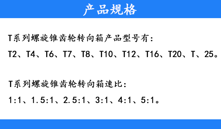 T系列螺旋錐齒輪轉(zhuǎn)向箱產(chǎn)品型號(hào):T2、T4、T6、T7、T8、T10、T12、T16、T20、T25
