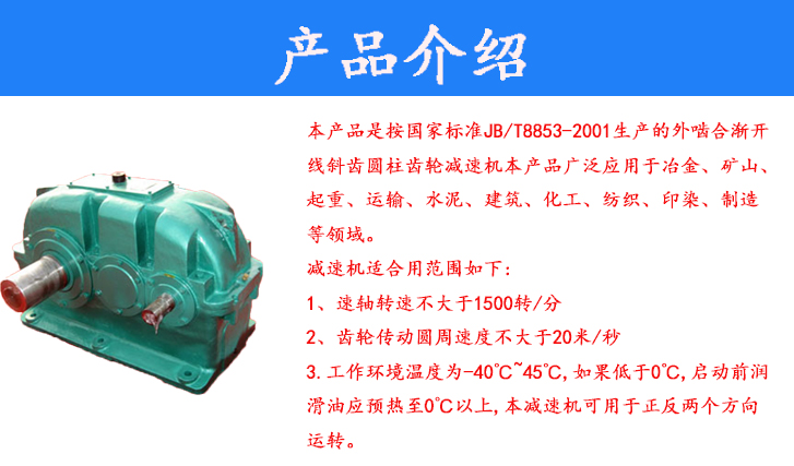 本產(chǎn)品是按國家標準JB/T8853-2001生產(chǎn)的外嚙合漸開線斜齒圓柱齒輪減速機本產(chǎn)品廣泛應用于冶金、礦山、起重、運輸、水泥、建筑、化工、紡織、印染、制造等領(lǐng)域。減速機適合用范圍如下:1,速軸轉(zhuǎn)速不大于1500轉(zhuǎn)/分2齒輪傳動圓周速度不大于20米/秒。3.工作環(huán)境溫度為-40℃~45℃,如果低于0℃,啟動前潤滑油應預熱至0℃以上,本減速機可用于正反兩個方向運轉(zhuǎn)
