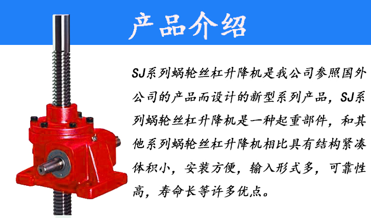SJ系列蝸輪絲杠升降機(jī)是我公司參照國(guó)外公司的產(chǎn)品而設(shè)計(jì)的新型系列產(chǎn)品,該產(chǎn)品是一種起重部件,和其他系列蝸輪絲杠升降機(jī)相比具有結(jié)構(gòu)緊湊、體積小、安裝方便、輸入形式多、可靠性高、壽命長(zhǎng)等許多優(yōu)點(diǎn)。