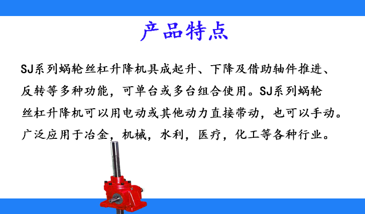 SJ系列蝸輪絲杠升降機(jī)具成起升、下降及借助軸件推進(jìn)、反轉(zhuǎn)等多種功能,可單臺(tái)或多臺(tái)組合使用。