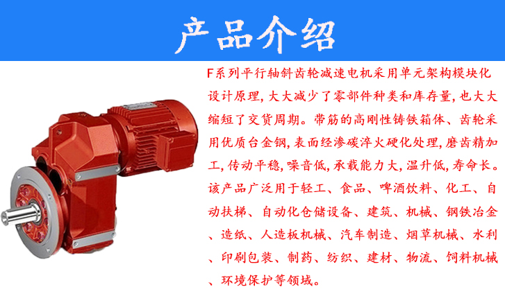 F系列平行軸斜齒輪減速電機(jī)采用單元架構(gòu)模塊化設(shè)計(jì)原理,大大減少了零部件種類和庫存量,也大大縮短了交貨周期。帶筋的高剛性鑄鐵箱體、齒輪采用優(yōu)質(zhì)臺金鋼,表面經(jīng)滲碳淬火硬化處理,磨齒精加工,傳動平穩(wěn),噪音低,承載能力大,溫升低,壽命長。該產(chǎn)品廣泛用于輕工、食品、啤酒飲料、化工、自動扶梯、自動化倉儲設(shè)備、建筑、機(jī)械、鋼鐵冶金、造紙、人造板機(jī)械、汽車制造、煙草機(jī)械、水利、印刷包裝、制藥、紡織、建材、物流、飼料機(jī)械、環(huán)境保護(hù)等領(lǐng)域。