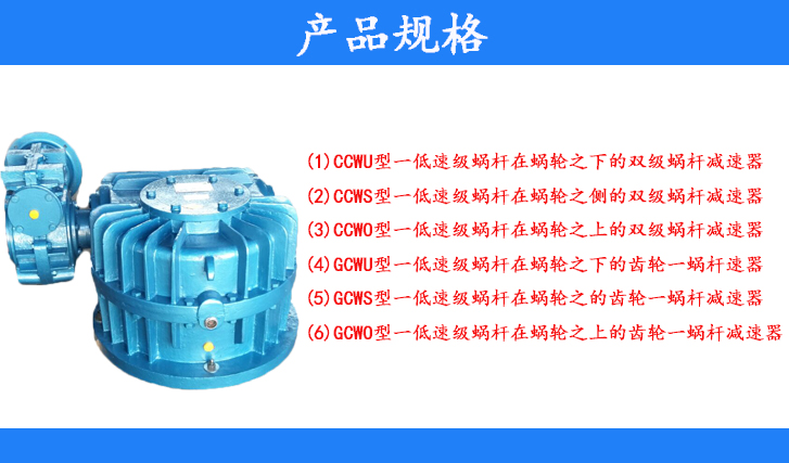 按低速級(jí)蝸桿置向不同可分為:蝸桿下置式、蝸桿側(cè)置式、蝸桿上置式三種結(jié)構(gòu)型式具有承載能力高、傳動(dòng)效率高,傳動(dòng)比大、結(jié)構(gòu)緊湊等特點(diǎn)