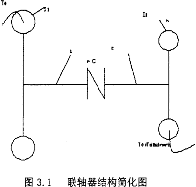 為了便于求解運動微分方程,需要對傳動軸系中聯(lián)軸器的主動和從動兩側(cè)的轉(zhuǎn)動慣量和剛度作力學(xué)模型的簡化。根據(jù)具體結(jié)構(gòu)情況,可以將軸系簡化為若干個等效轉(zhuǎn)動慣量圓盤,以具有某一剛度的周聯(lián)系起來。通常比較典型的是簡化為兩個等效的圓盤,配置在聯(lián)軸器的兩側(cè)。并設(shè)定所聯(lián)兩軸的剛性很大,只有聯(lián)軸器具有彈性和阻尼。如圖3.1所示
