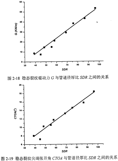 在裂紋穩(wěn)態(tài)擴(kuò)展的條件下,動(dòng)態(tài)能量釋放率G或裂紋尖端張開角CTOA同管道內(nèi)壓p0或徑厚比SDR之間均呈線性關(guān)系。由此關(guān)系可便捷地推算任意設(shè)計(jì)參數(shù)下的裂紋驅(qū)動(dòng)力。通過和第四章介紹的小試件實(shí)驗(yàn)的動(dòng)態(tài)斷裂韌性結(jié)果相對照,可以得到裂紋止裂或擴(kuò)展的結(jié)論。