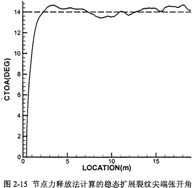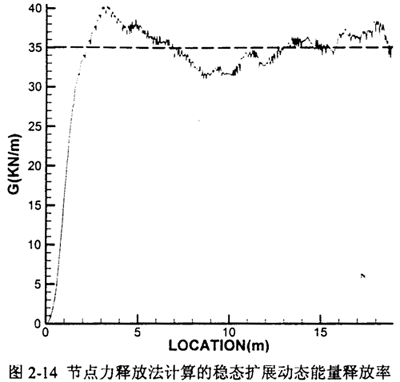 圖2-14反映了節(jié)點(diǎn)力釋放法計(jì)算的動(dòng)態(tài)能量釋放率與裂尖位置的關(guān)系,其結(jié)果因前面提到過的有限元算法的原因而略有抖動(dòng),G的穩(wěn)態(tài)值約35KN/m,遠(yuǎn)高于X70鋼材的斷裂韌性Gd<10KN/m。