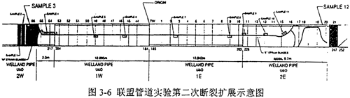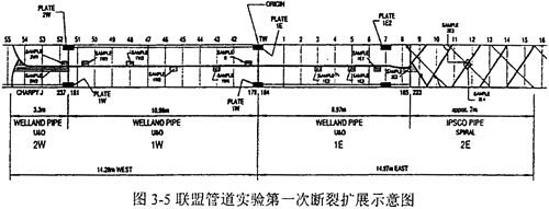 實驗二的斷口均為剪切斷裂,裂紋擴(kuò)展長度為33.6m。由于1W和1E沖擊功低于預(yù)測的止裂沖擊韌性,因而裂紋均沿1W和lE軸向直線擴(kuò)展并分別進(jìn)入2W和2E樣管,最后在2W和2E樣管中止裂,如圖3-6所示。