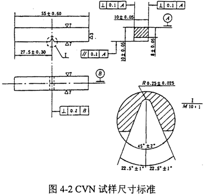 GB2106-80和ASMME23-96規(guī)定試樣標(biāo)準(zhǔn)尺寸為10×10×55mm,缺口深度為2mm。對于2/3尺寸試樣,厚度減為6.67mm,截面尺寸不變,如圖4-2。