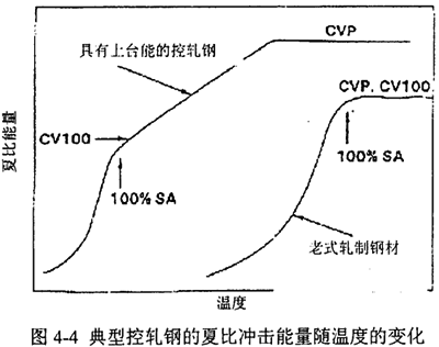 對于斷口上有分離的材料,隨溫度的升高,分離將最終消失,這是因為馬氏體和貝氏體帶也達(dá)到了上平臺溫度。圖4-4表示典型控軋鋼的夏比能量隨溫度的變化。夏比沖擊試樣上100%剪切面積對應(yīng)的最小夏比能稱為CV100。當(dāng)所有的分離都消失時,上平臺能CVP出現(xiàn),其大小可能高于CV100。
