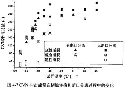 圖4-7選擇的管線鋼在實驗溫度范圍內(nèi)同時經(jīng)歷了韌脆轉(zhuǎn)化和斷口分離,對上述結(jié)論給予了證實,并可以看到發(fā)斷口分離的試件的韌性稍低于未發(fā)生斷口分離的試件。