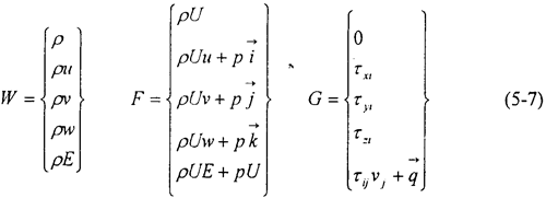 式中P為密度,U=u+v+w表示速度,E為總能,,分別為沿x,y,z方向的單位矢量。為粘性應(yīng)力項(xiàng),是熱通量。