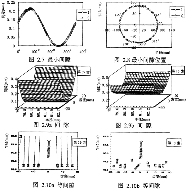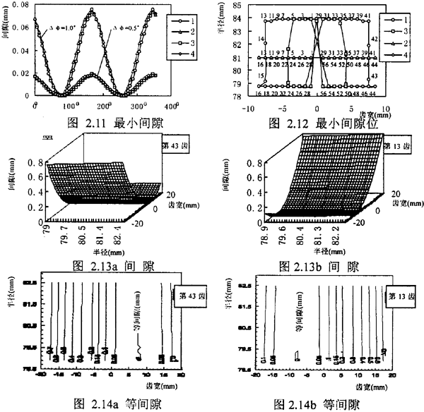 不失一般性設(shè)內(nèi)齒輪為主動輪外齒輪相對內(nèi)齒輪徑向位移Δx=-0.2mm,Δy=0.無載荷的情況下計(jì)算結(jié)果:圖2.7是內(nèi)齒旋轉(zhuǎn)一周時(shí)任意一對齒的最小間隙的變化或在任意的轉(zhuǎn)角0下各齒對的最小間隙。2.8 圖是半徑方向最小間隙所在的位置,由于外齒是鼓形齒且沒有偏角,在無載荷的情況下只在齒輪的中央齒廓處嚙合所以僅畫出半徑方向最小間隙位置。圖2.7 曲線1 是用本章方法計(jì)算的結(jié)果,曲線2 是用Heinz 幾何方法計(jì)算的結(jié)果,我們可以看出用兩種方法計(jì)算最小間隙的大小非常一致,但位置不同圖2.8 ,因?yàn)镠einz 方法僅規(guī)定內(nèi)外齒在分度圓上嚙合,本文是從全齒高嚙合狀態(tài)來考慮最小間隙及其位置的。圖2.7中250° 近間隙為零,即在無載荷或輕載荷時(shí)內(nèi)外齒輪在此處附近的對齒嚙合,相應(yīng)圖2.8 在250°嚙合處的縱坐標(biāo)大致為基圓的半徑,即嚙合線與基圓相切并與△x 位移線平行,這與前面所說與零齒差齒輪嚙合相似;圖2.9, 2.10 是在θ=0時(shí)第39 齒(圖a)和第13齒(圖b)的齒面間隙和等間隙曲線,從圖中可以看出最小間隙在齒寬的中央,這是因內(nèi)外齒沒有發(fā)生相對轉(zhuǎn)角位移,而且間隙沿齒高方向間隙變化的梯度小,即分度圓上的間隙與齒高方向的間隙相關(guān)很小,而沿著齒輪軸向的間隙變化的梯度較大,等間隙曲線沿軸向分布呈帶狀,這也是Heinz和本文計(jì)算最小間隙大小相近的原因。