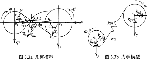 在以往對外齒輪模型簡化時主要采用兩種方法如圖3.3a、3.3b幾何模型和力學(xué)模型。在幾何耦合模型中,齒輪輪齒被視為剛體。假定:1.嚙合過程中輪齒始終保持接觸,不脫嚙。2.嚙合線方向保持不變。要滿足假設(shè)1,按兩齒輪接觸表面法向速度相等原則: