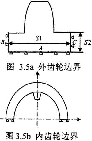 對于外齒輪Daimler-Benz公司選取邊界的方法是先取半個齒輪進行有限無計算,這是從整體來考慮問題,然后根據(jù)計算的結(jié)果來選擇邊界的范圍,其所定的邊界寬度如圖3.5a,S1=6.1m,m是齒輪的模數(shù)。Chaber所取的邊界的方法是考慮圣維需原理,其所定的邊界深度為S2=1.5m。綜合以上兩者的研究,用有限無計算外齒的變形,計算模型的邊界范圍可取: