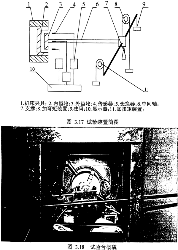 為了驗(yàn)證理論解析結(jié)果,我們設(shè)計了如圖所示的試驗(yàn)裝置,取兩個雙聯(lián)齒輪聯(lián)軸器(一個外齒輪為直齒,一個外齒輪為鼓形齒)。對其進(jìn)行彎曲剛度的測試。齒輪聯(lián)軸器的內(nèi)齒圈,固定在車床的三爪卡盤上,雙聯(lián)齒輪外齒的一端插入內(nèi)齒圈與內(nèi)齒嚙合,而另一端支承在支點(diǎn)A上,在A端有兩套滑輪杠桿系統(tǒng)如圖3.17,一套是用來給齒輪聯(lián)軸器施加扭矩,另一套是用來給齒輪聯(lián)軸器施加X方向的彎矩。三個傳感器裝在如圖所示的位置,測量垂直和水平方向的位移。